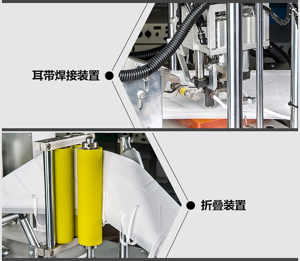 3.生產(chǎn)效率高,折疊成型,耳帶焊接結(jié)實(shí)美觀,拉力強(qiáng)勁,自動(dòng)上鼻梁條和自動(dòng)印刷功能。