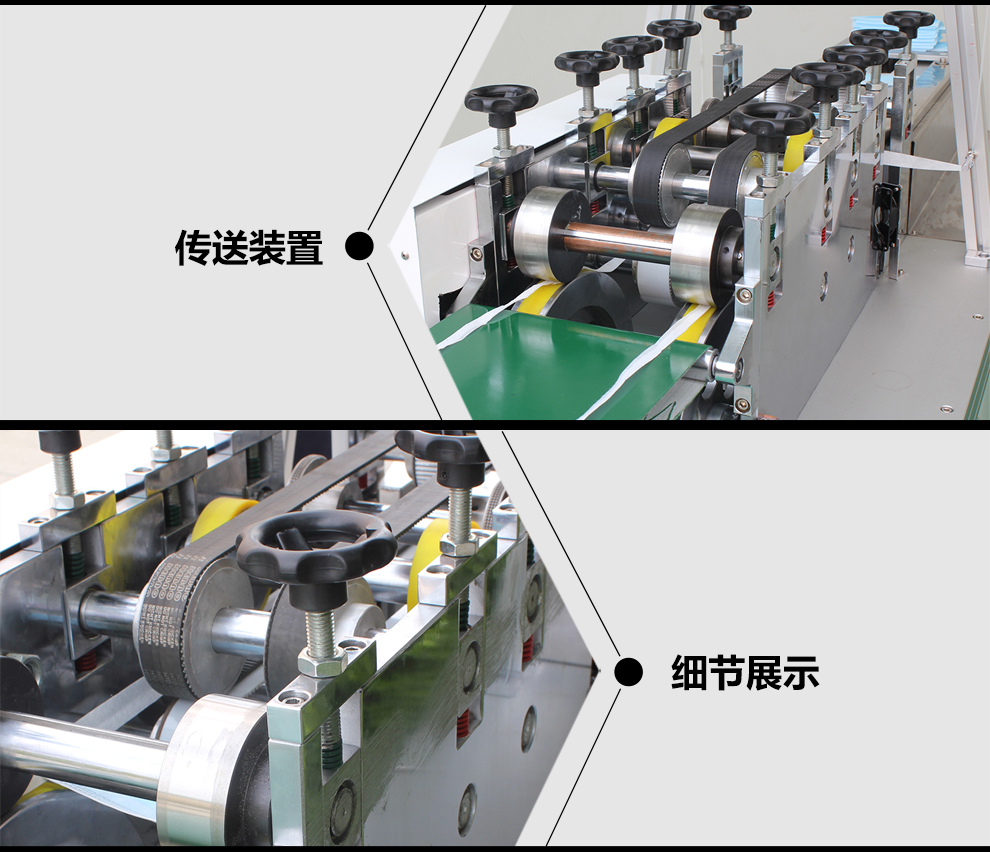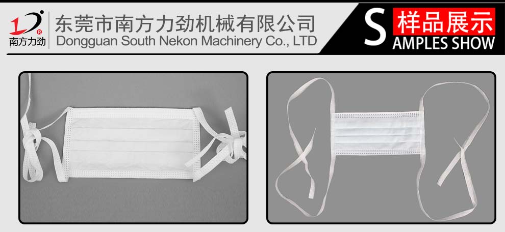 采用超聲波焊接方式將無紡布綁帶焊接于口罩本體兩側,需要人工將口罩本體置于機器的傳輸帶上,后續拉筒包邊,花輪壓合,綁帶切斷和輸出成品工作均為全自動完成。