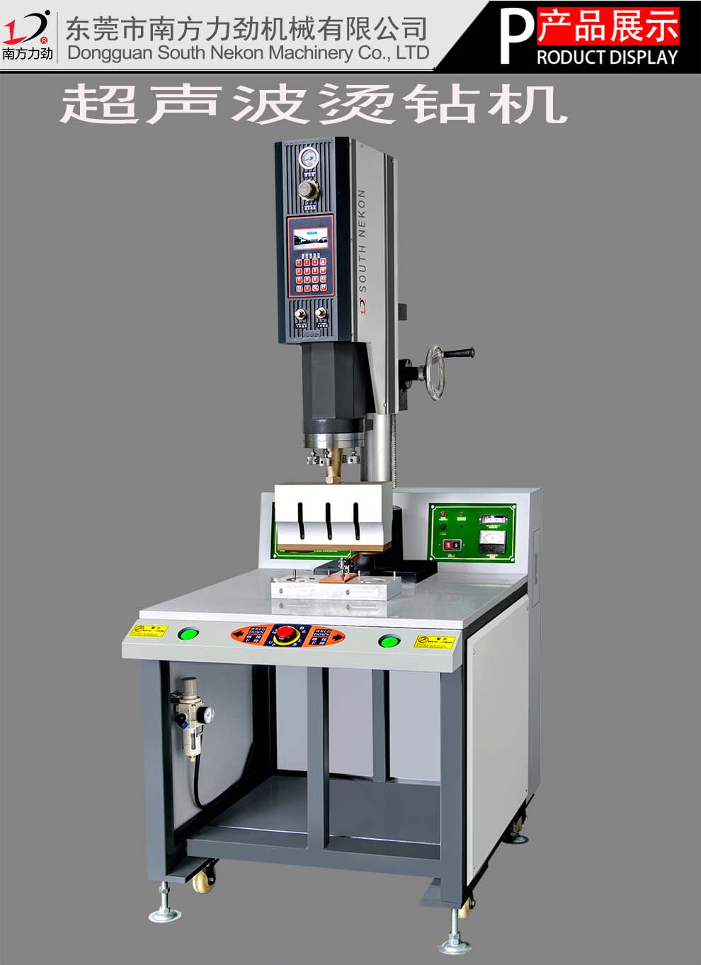超聲波燙鉆機又稱超聲波釘鉆機/超聲波鑲鉆機/超聲波燙圖機/超聲波整版燙/鞋面燙鉆機/燙鉆機/釘鉆機/鑲鉆機/燙圖機/鉆石手動粘貼機,焊鉆機或燙片焊接機,其原理是利用超聲波主機輸出超聲壓電信號,經壓電換能器將超聲壓電信號轉換成機械能,再推動加工件在粘貼表面高速磨擦,工件磨擦產生的熱量熔化其接觸面的膠料,使其合二為一,從而達到粘貼的目的。因粘貼配件與粘接面直接熔合,故粘貼結構不易脫開。
